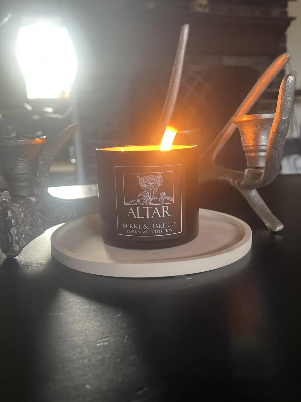 This rose scented candle will fit into any vampire home or velvety bedroom. This is not your traditional rose candle! Altar is the villain of floral family, a damask rose top note is followed by dark red wine with a subtle base of musk to carry and warm the scent while a spicy wood note adds even more complexity. It is truly an intoxicating and sensual fragrance.